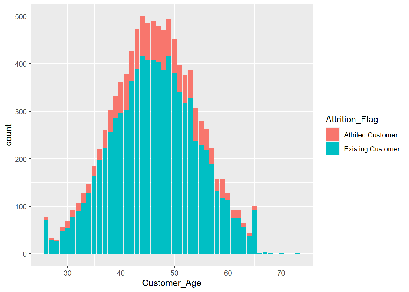ggplot(BankChurners)+geom_bar(aes(x=Customer_Age,fill=Attrition_Flag))