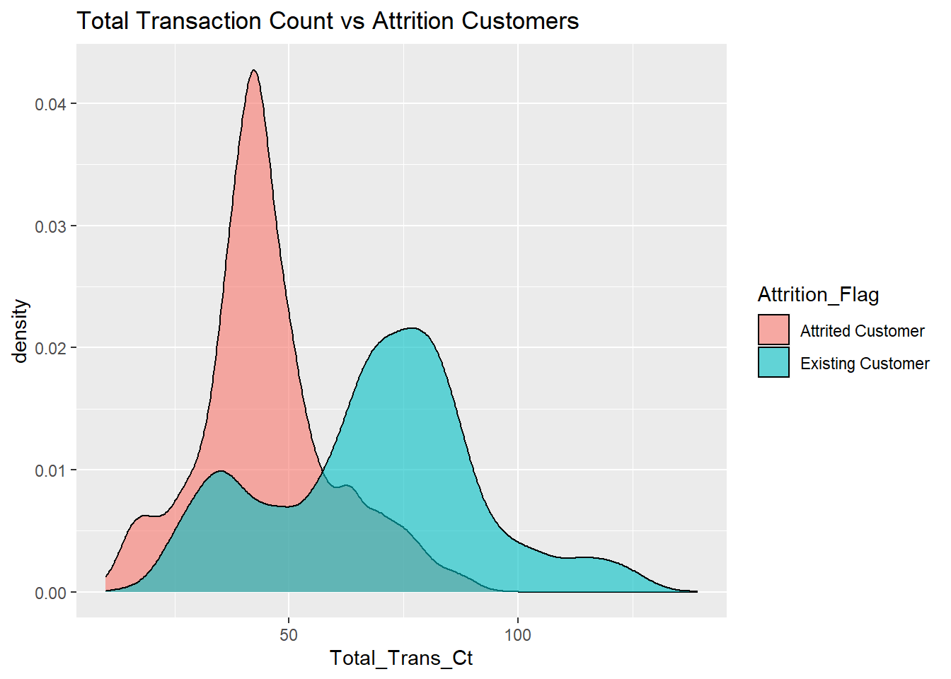 f1 <- BankChurners %>% ggplot(aes(x=Total_Trans_Ct,fill=Attrition_Flag)) + geom_density(alpha=0.6) + labs(title='Total Transaction Count vs Attrition Customers')