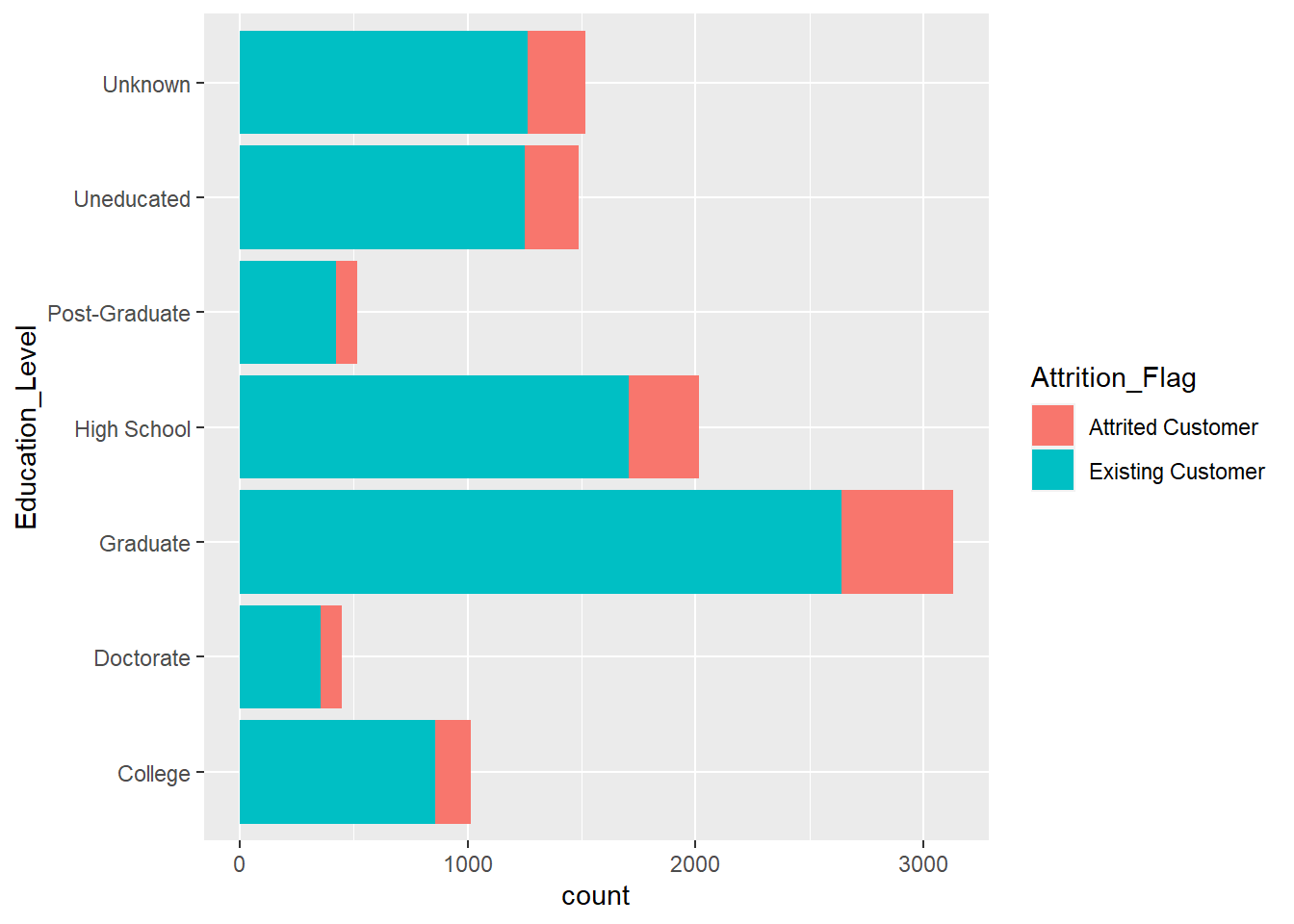 ggplot(BankChurners)+geom_bar(aes(x=Education_Level,fill=Attrition_Flag))+coord_flip()