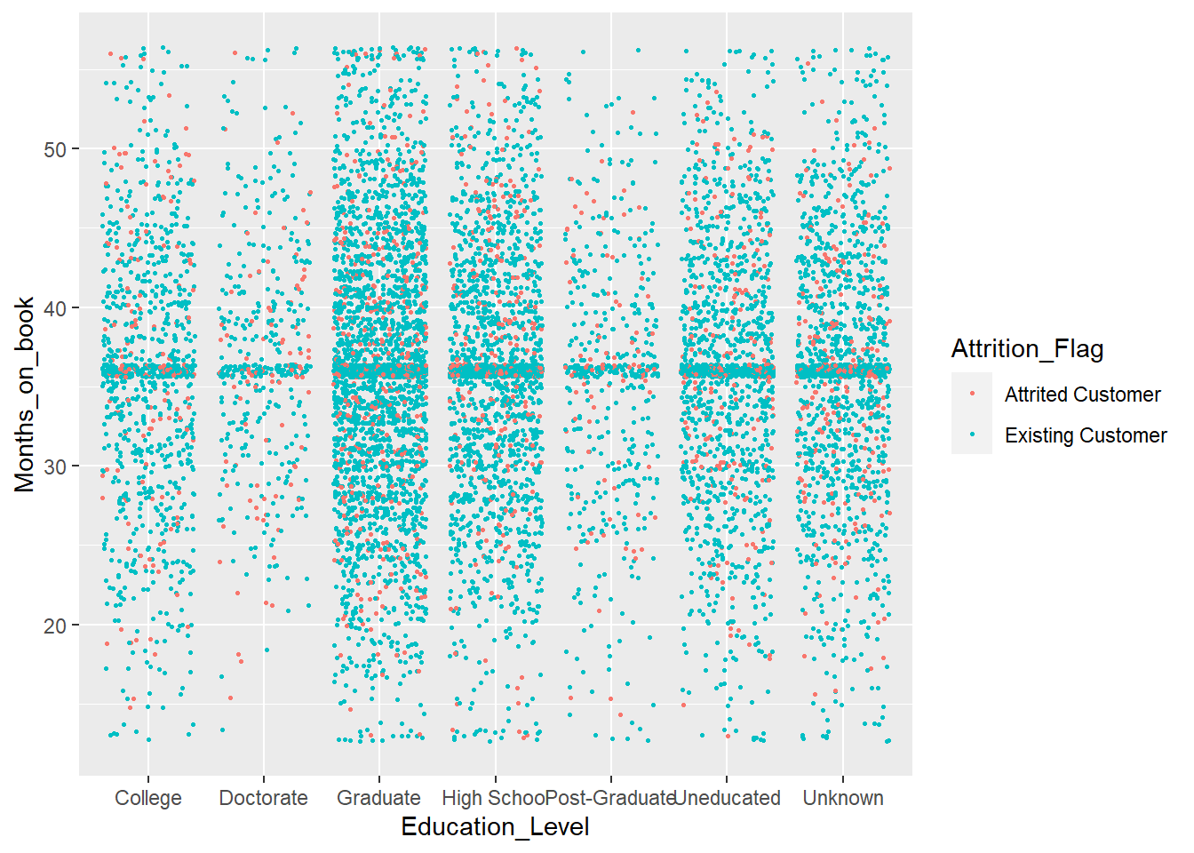 ggplot(BankChurners)+geom_point(aes(x=Education_Level,y=Months_on_book,color=Attrition_Flag),position="jitter",size=0.5)