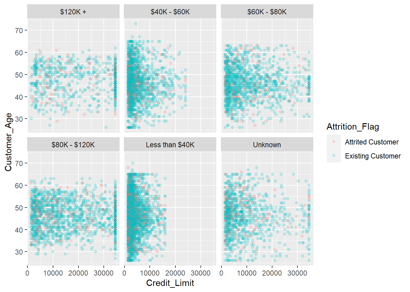 ggplot(BankChurners,aes(x=Credit_Limit, y= Customer_Age,color = Attrition_Flag))+geom_point(alpha = 0.2)+facet_wrap(~Income_Category)
