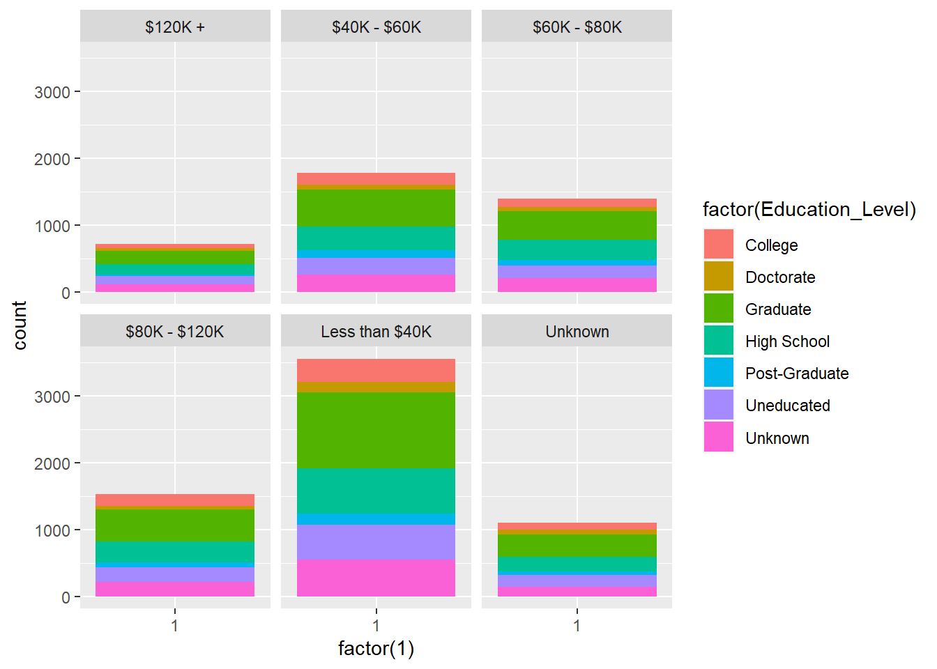 ggplot(BankChurners,aes(x=factor(1), fill=factor(Education_Level)))+geom_bar(width = 1)+facet_wrap(~Income_Category)