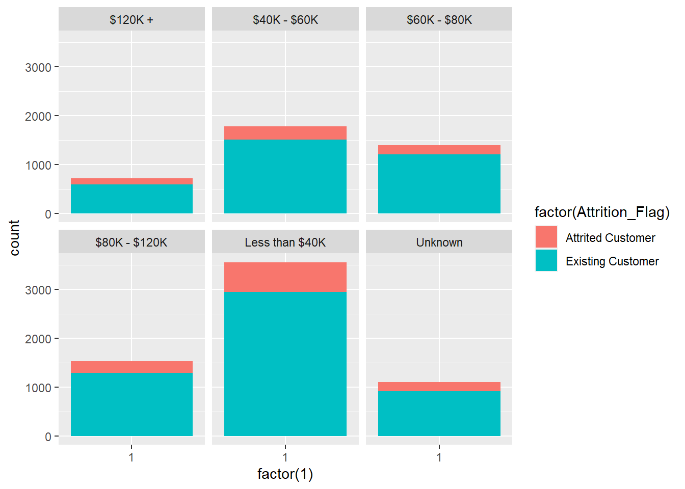 ggplot(BankChurners,aes(x=factor(1), fill=factor(Attrition_Flag)))+geom_bar(width = 1)+facet_wrap(~Income_Category)