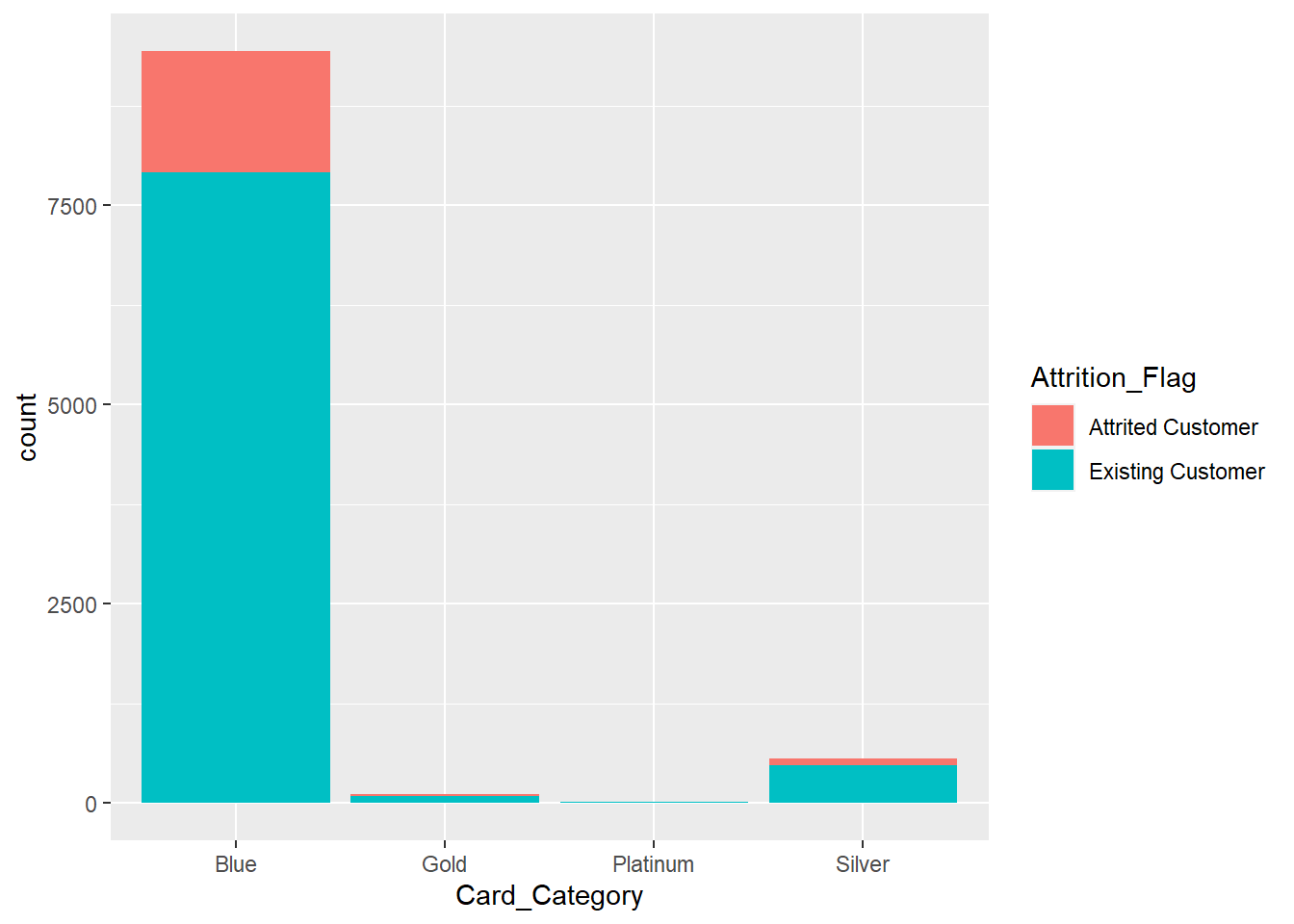 ggplot(BankChurners)+geom_bar(aes(x=Card_Category,fill=Attrition_Flag))