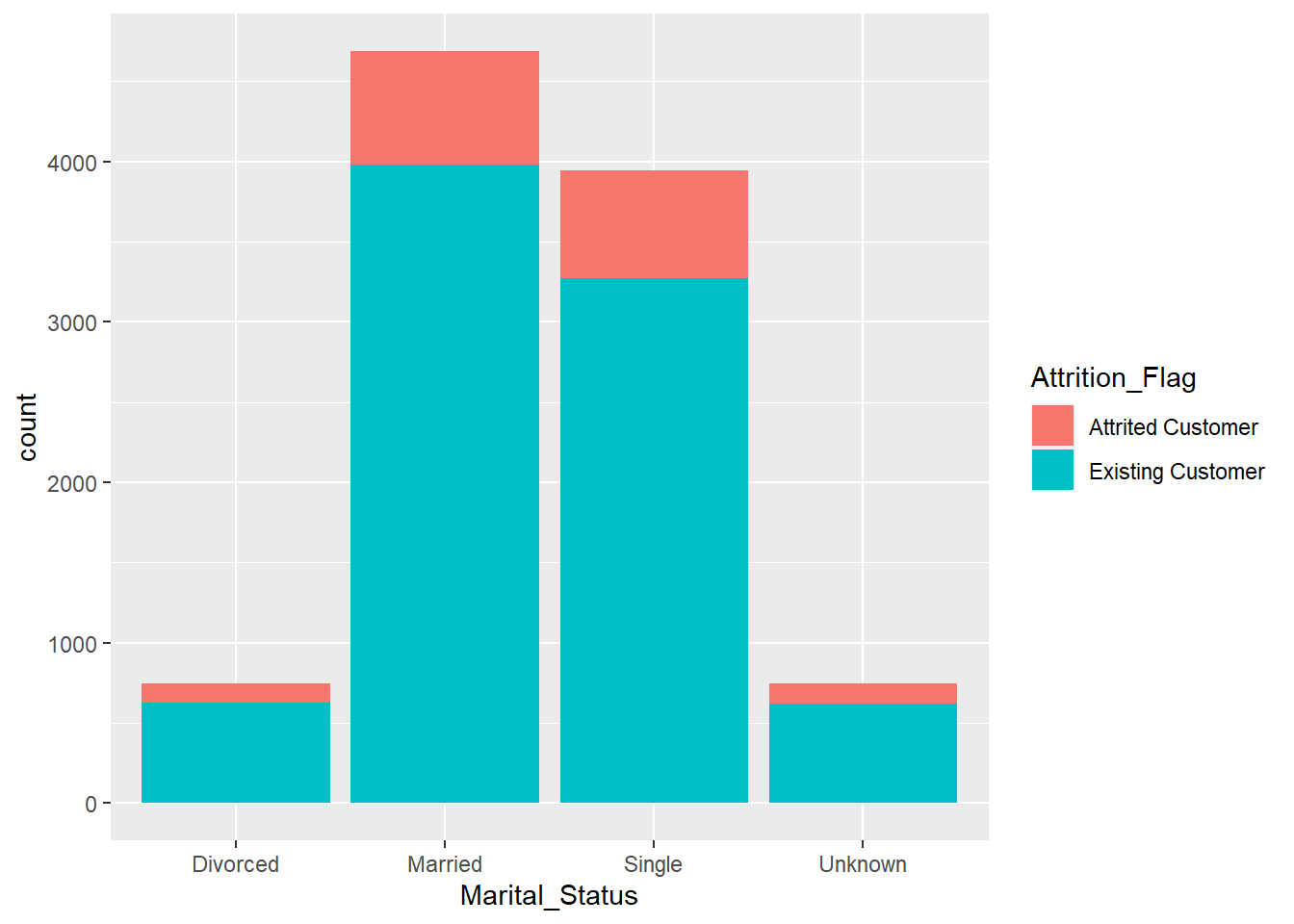 ggplot(BankChurners)+geom_bar(aes(x=Marital_Status,fill=Attrition_Flag))